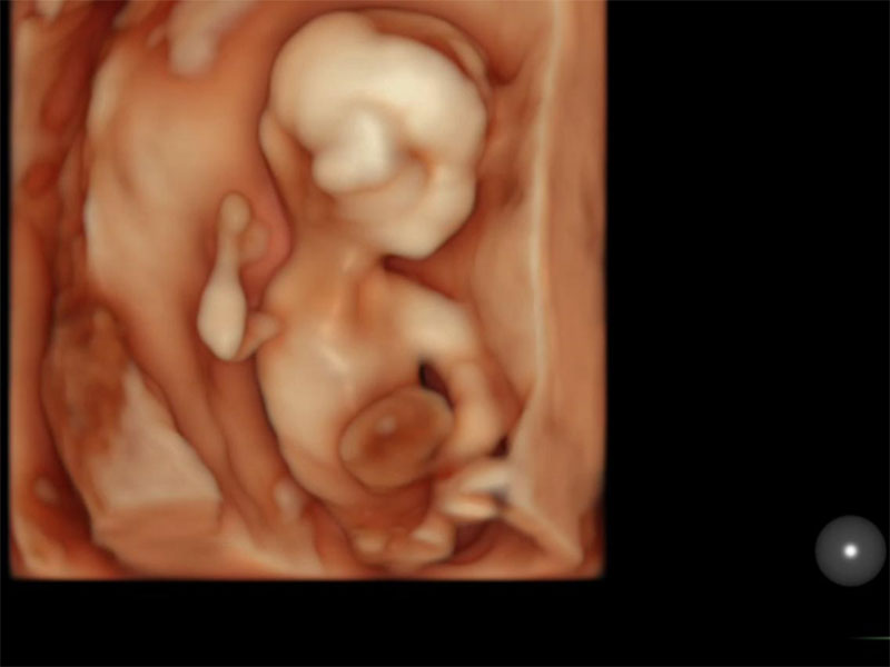Görsel notu: Bebekte 12.haftada omfalosel şeklinde anomali tanısı (transabdominal 3D US ile) (Omfalosel: karın içi organların kese içinde göbek deliğinden fıtıklaşması)